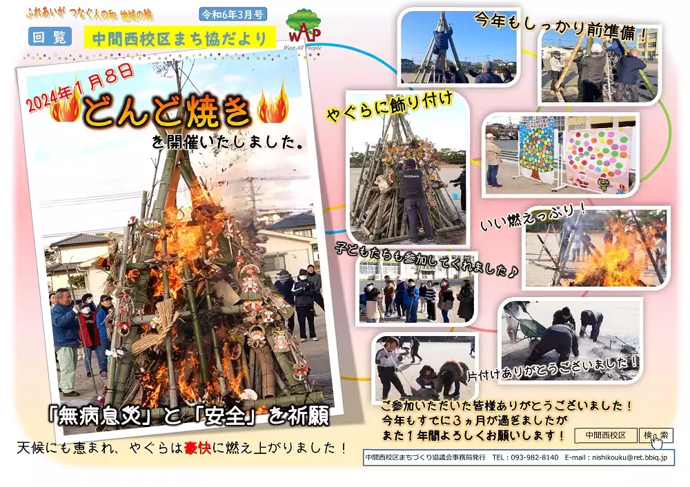 中間西校区まち協だより 中間西校区まちづくり協議会では、校区各自治会を通じて回覧していただく「中間西校区まち協だより」を発行しています。 個別に入手希望の方は、西校区まちづくり協議会までお知らせください。(093-982-8140) 令和6年3月号紹介 画像クリックで別画面で拡大画像を表示